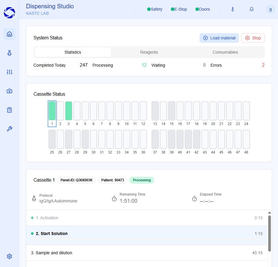 Kaste Dispensing Studio is the central control hub for the Kaste Lab benchtop system, giving engineers full visibility and command over every dispensing step in real time. Through a unified touchscreen interface, users can design and execute protocols, manage reagents and cassettes, tune temperature, motion, and pressure setpoints, and leverage integrated vision and logging tools to verify each dispense, troubleshoot issues, and maintain assay‑grade performance across pumps, fluids, and applications.