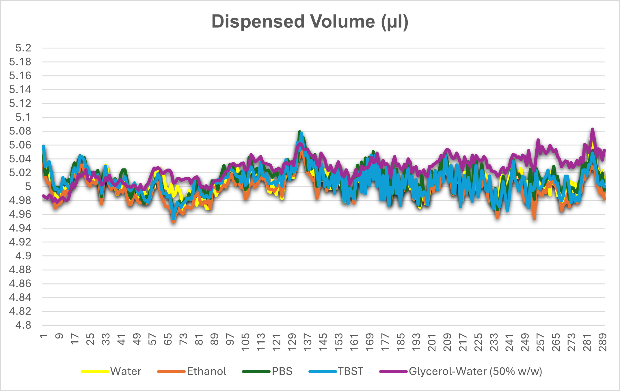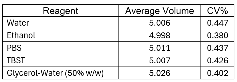 Takeaway: Regardless of fluid characteristics, the Nano II delivered highly consistent volumes, critical for assay reproducibility and system robustness.